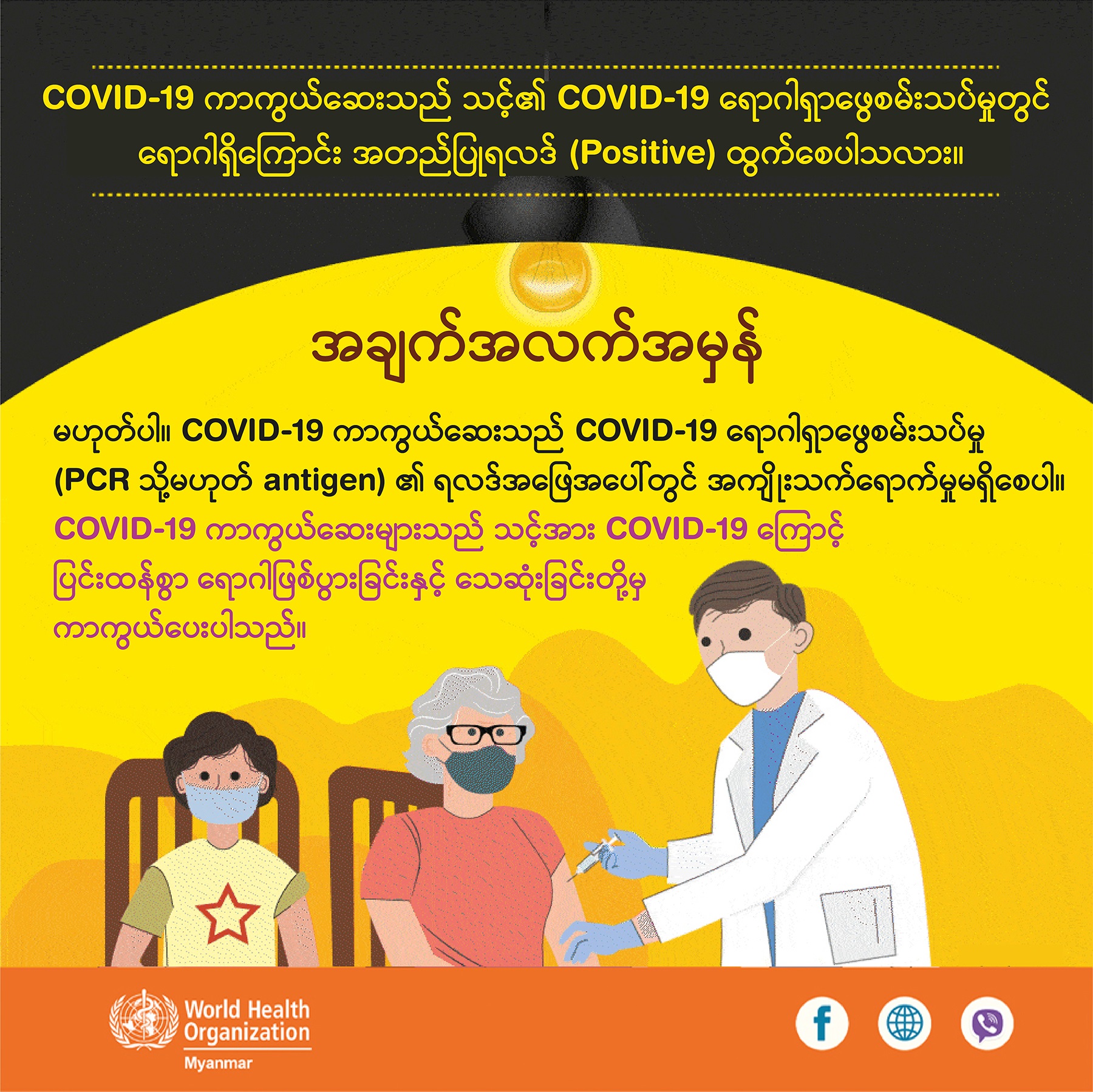 COVID-19 ကာကွယ်ဆေးသည် သင့်၏ COVID-19 ရောဂါရှာဖွေစမ်းသပ်မှုတွင် ရောဂါရှိ‌ကြောင်းအတည်ပြုရလဒ် (Positive) ထွက်စေပါသလား?