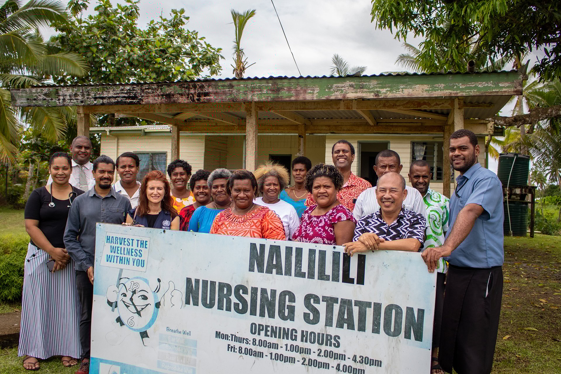 WHO and Naililili staff and patients outside the Nursing Station. Community Health Worker Anamaria Raicoki pictured second from left, back row